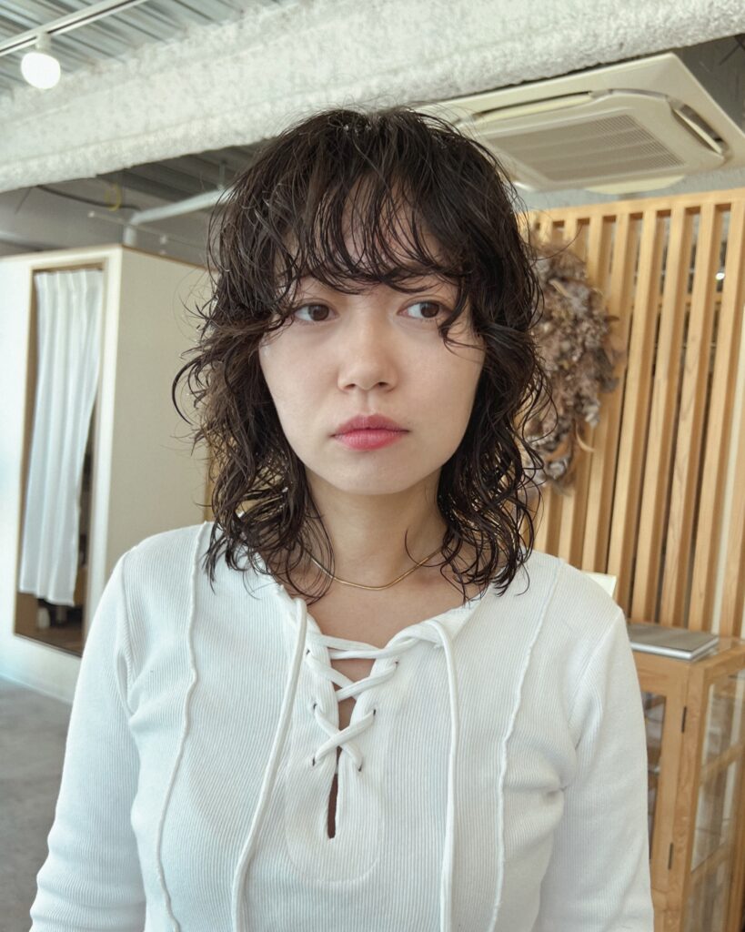 レイヤーをウルフベースまで切り込んで無造作なパーマをかけたスタイル。